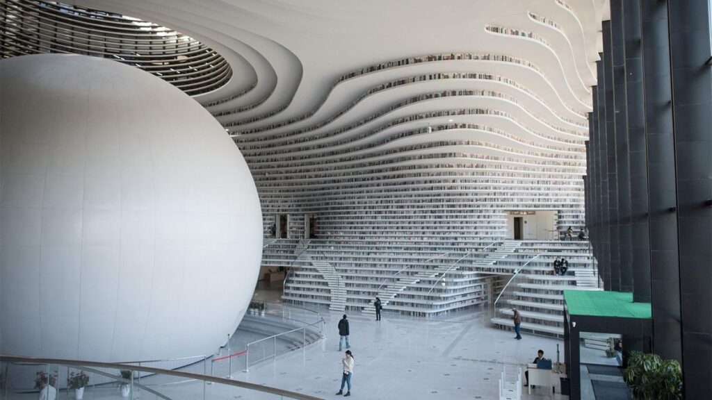 Kalau kamu pernah melihat foto dinding buku berbentuk ombak yang viral di internet — itulah Tianjin Binhai Library. Desain interiornya futuristik dan unik, seakan kamu berjalan di dalam pusaran kata-kata. Selain menampung ribuan buku, tempat ini juga menjadi ikon arsitektur dunia modern.